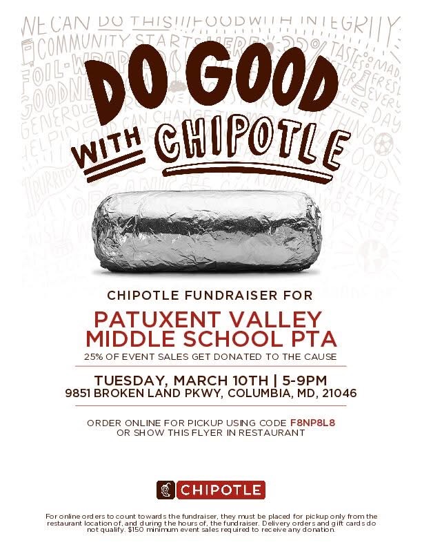 Eat dinner out at the Chipotle on Brokenland Parkway to support the PVMS PTSA!! Show the flier below when ordering in the restaurant or use code F8NP8L8 when ordering online. 25% of the event sales will go right to the PTSA to support our upcoming activities!!