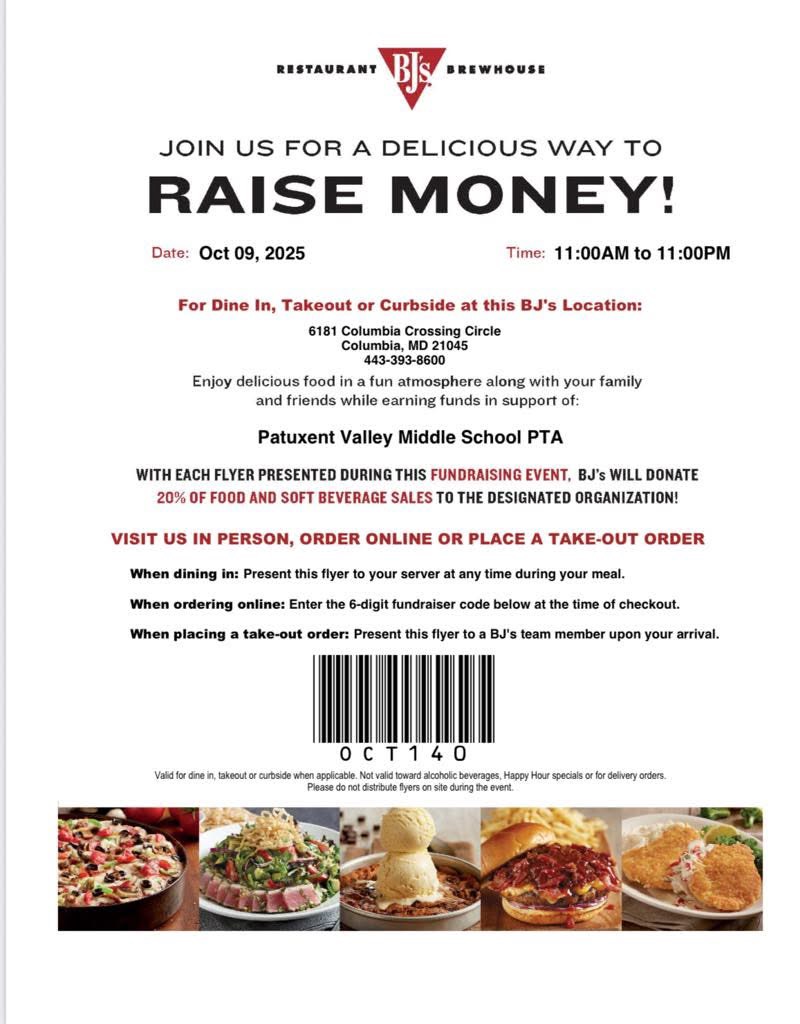 Eat out at BJ’s Restaurant and Brewhouse today, Thursday, Oct. 9th, from 11 am - 11 pm and support the PVMS PTSA! In person, online, or takeout! Please show the flier or use the code OCT140 when ordering online.