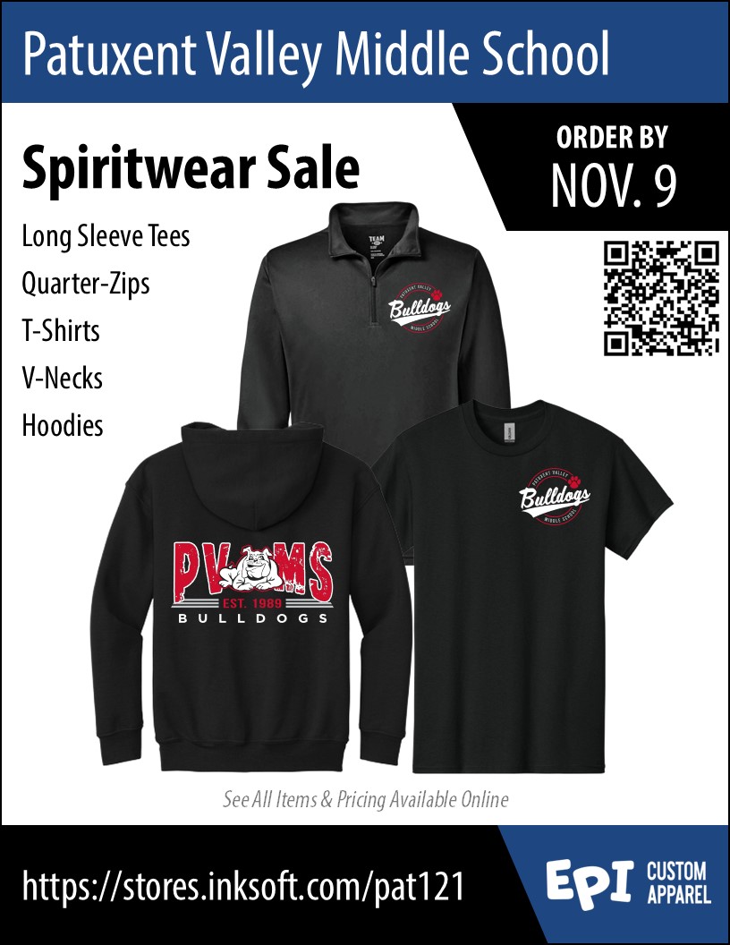 Show your Bulldog Pride and get your PVMS Spiritwear now! T-shirts, long sleeve shirts, hoodies, and quarter zip shirts are available for sale in youth and adult sizes through Sunday, Nov. 9th. Purchase online at https://stores.inksoft.com/pat121. Items will be delivered to the school in early December.